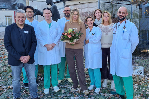 Claudia Textor arbeitet im Sekretariat der Allgemein- und Viszeralchirurgie. Mit einem Blumenstrauß und einem Geschenk bedankte sich Chefarzt Dr. Claas Brockschmidt im Namen seines gesamten Teams.