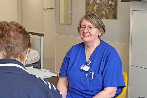 In der Zentralen Notaufnahme am Mops erhalten alle Patientinnen und Patienten über 75 eine Ersteinstufung der Gefährdung nach standardisierten, wissenschaftlich anerkannten kurzen Tests. „Liegt ein Risiko vor, begleite ich die Patienten während des gesamten Krankenhausaufenthalts“, und kläre die Patienten intensiv auf, was als nächstes passiert. Wir schaffen so Orientierung, berichtet die Altenpflegerin. Das Bild einer Dahlie ist ihr Erkennungszeichen. Sie trägt es an der Dienstkleidung und es liegt auf dem Nachttisch im Patientenzimmer – mit den Kontaktdaten der Fachfrau. „Zuhören, ernst nehmen und ein enger Kontakt mit den Angehörigen hilft allen.“